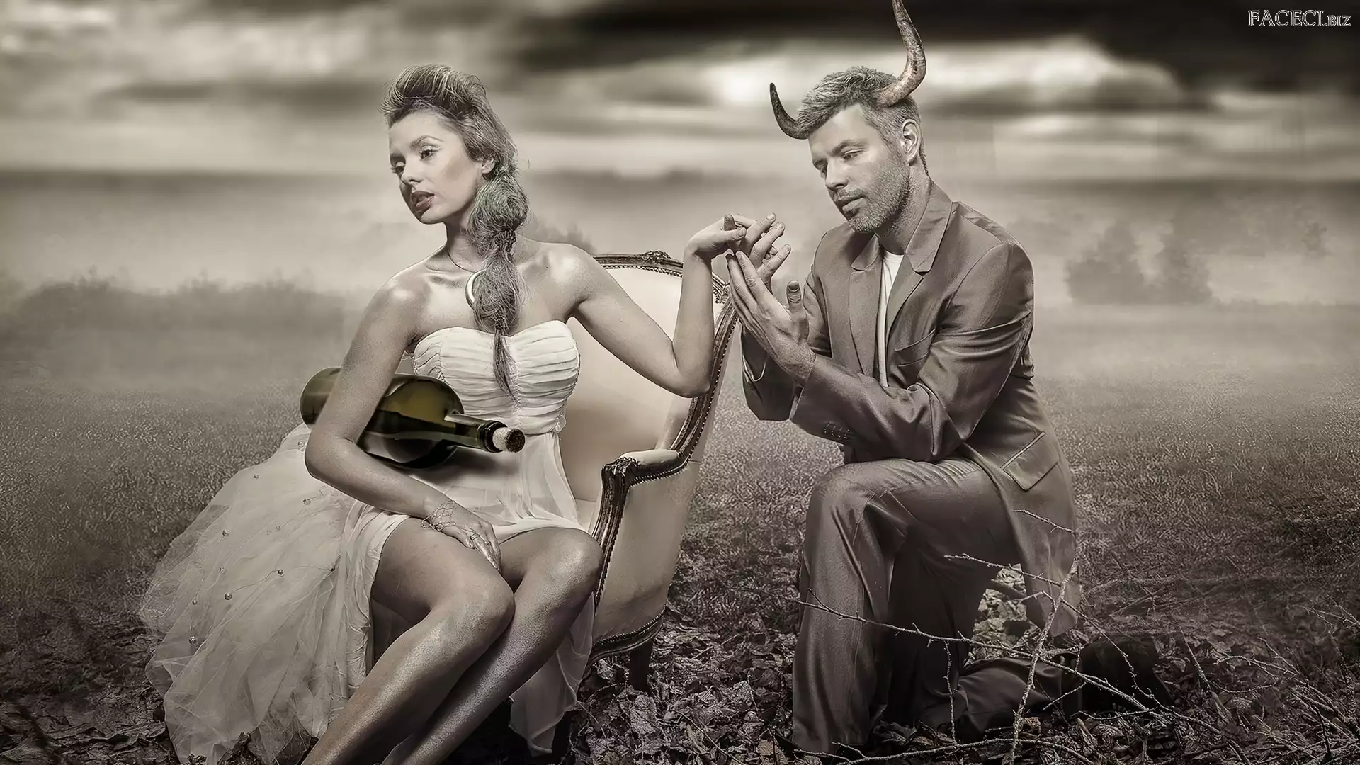 Diabeł, Suknia, Kobieta, Mężczyzna, Rogi, Biała, Butelka - faceci.biz